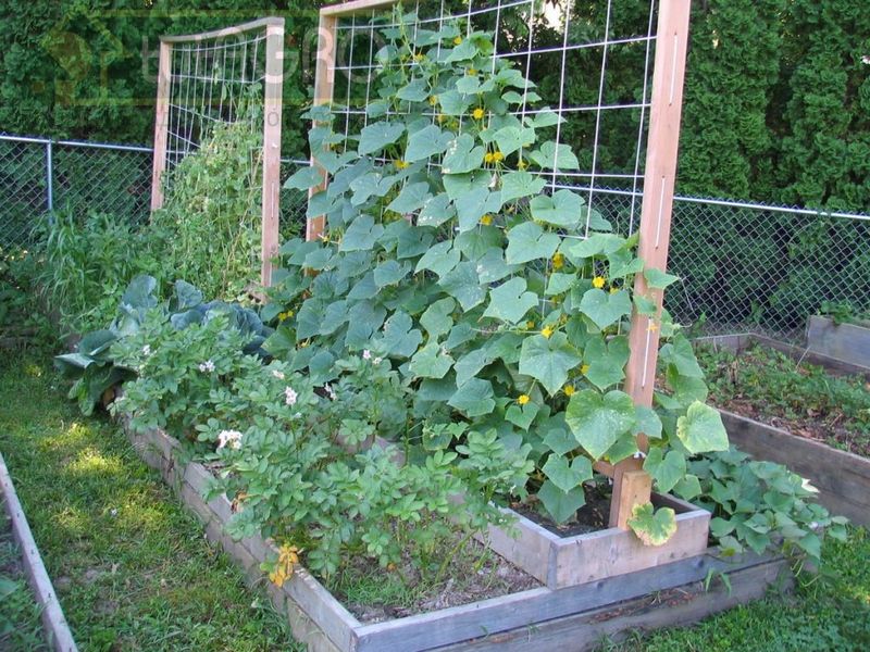 В качестве основы, кроме проволоки и бечевки, можно использовать шпалерную сетку с ячейками - усикам огурца за них очень удобно цепляться. Сетку можно натянуть на каркас любой формы. Кроме того, сетка довольно прочная, и на ней можно выращивать не только огурцы, но и цуккини, и патиссоны, и даже тыквы (с плодами небольших размеров).