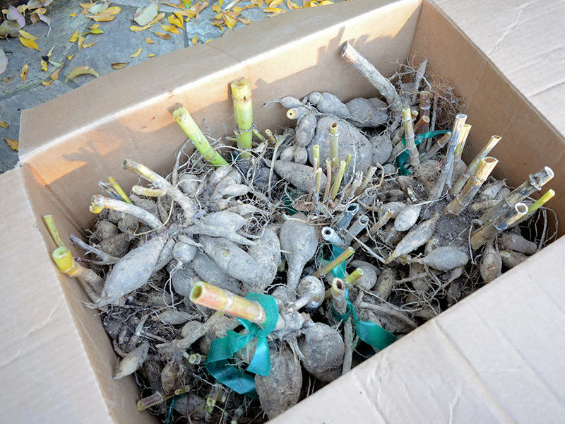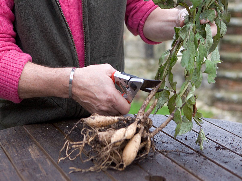Почки, которые на будущий год дадут стебли и цветки, расположены на самой верхушке клубней, практически на стебле. Поэтому очень важно не повредить эту часть растения. Если при выкопке клубень был разрезан лопатой, присыпьте срез обыкновенной древесной золой, и он заживет в период дозаривания.
