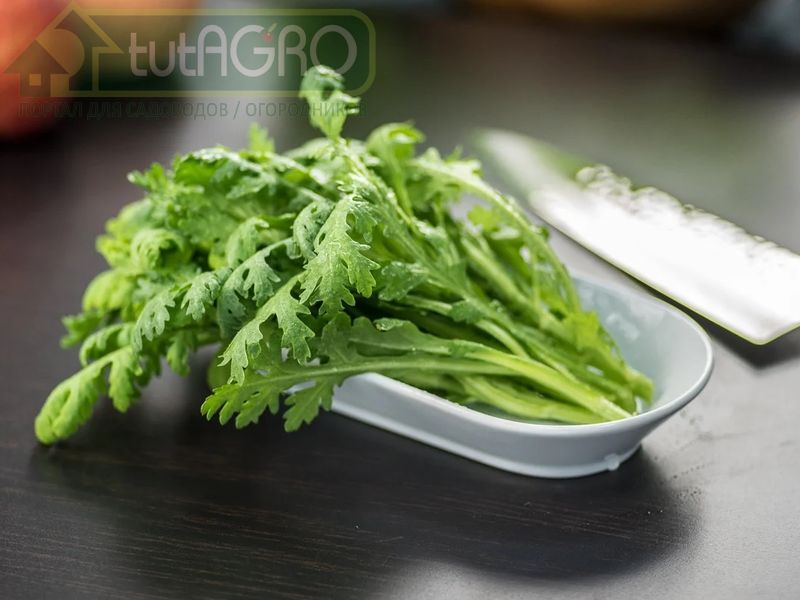 Сочные листья и верхушки молодых побегов, а также бутончики отщипывают один-два раза в неделю. Их добавляют в салаты, супы, хорошо гармонируют они с тушеным мясом. Вкус молодых побегов хризантемы напоминает вкус сельдерея.