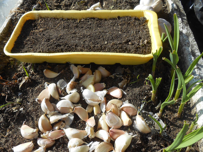 В емкости зубки высаживают рядами на расстоянии 2 – 3 см друг от друга на глубину 3 – 4 см. Уход за растениями заключается в регулярных и обильных поливах почвы. Подкармливать растения не имеет смысла, так как запасов питательных веществ в зубке и почве достаточно для завершения этого процесса.