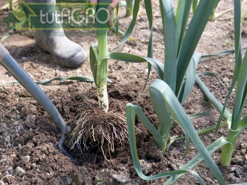Для того, чтобы черешок лука-порея имел светлый оттенок и мягкий вкус, за неделю до уборки проводят высокое окучивание грядок, междурядья накрывают темной пленкой. В дальнейшем производят аккуратное выкапывание растений, стараясь не повредить «стебель», т.к. от сохранности растения зависит продолжительность его хранения.