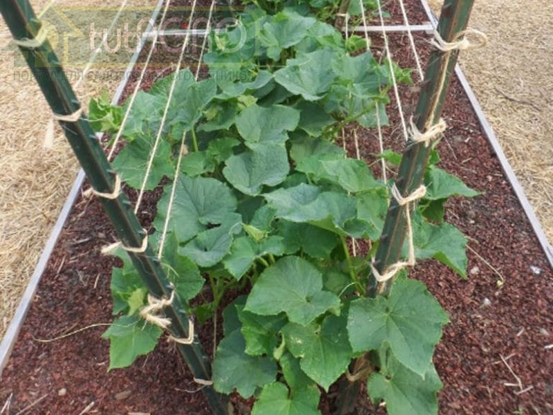 В качестве основы, кроме проволоки и бечевки, можно использовать шпалерную сетку с ячейками - усикам огурца за них очень удобно цепляться. Сетку можно натянуть на каркас любой формы. Кроме того, сетка довольно прочная, и на ней можно выращивать не только огурцы, но и цуккини, и патиссоны, и даже тыквы (с плодами небольших размеров).