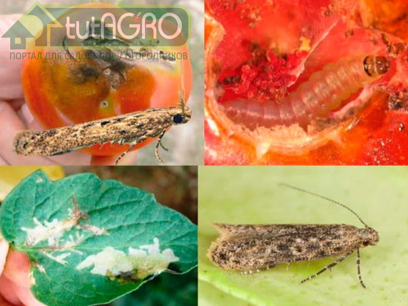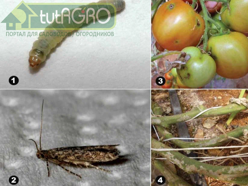 Томатная моль: 1 - гусеница (лярва) 2 - бабочка, 3 - повреждения плодов, 4 - повреждения растений.