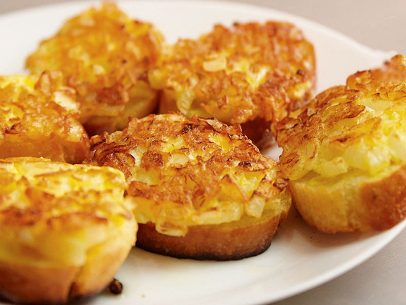 На горячую сковороду выложить кусочки белого хлеба, на каждый кусочек положить начинку из обжаренного лука, сверху посыпать тертым сыром. Накрыть сковороду крышкой, держать 2-3 минуты, пока сыр не расплавится, а хлеб снизу не подрумянится.