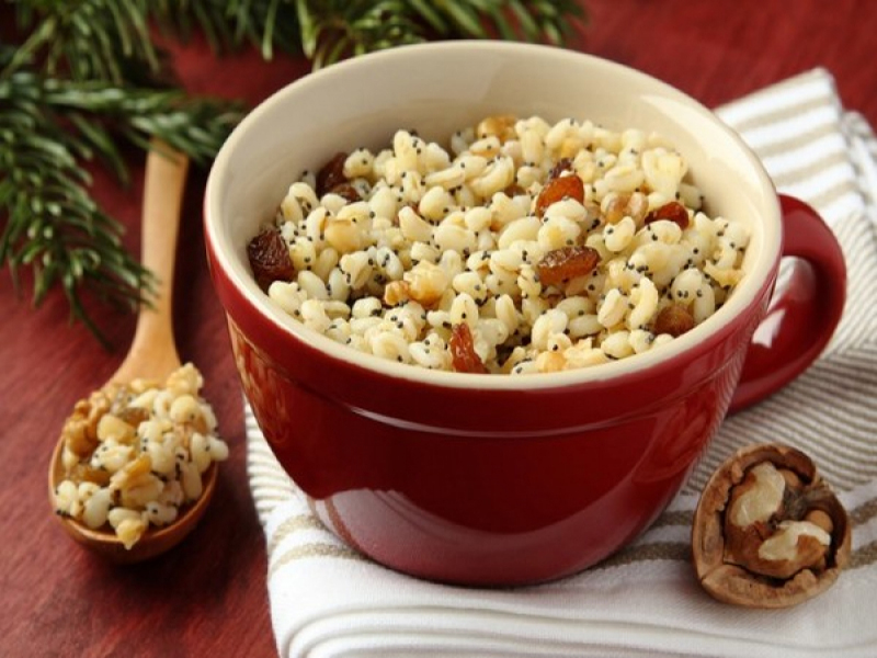 Когда будет готова пшеница, слейте с нее воду, добавьте разбухший изюм, рубленые орехи, заправьте маком и малиновым вареньем, перемешайте. При необходимости можно добавить еще немного меда. Для более интересного вкуса можно насыпать в готовую кутью цукаты.