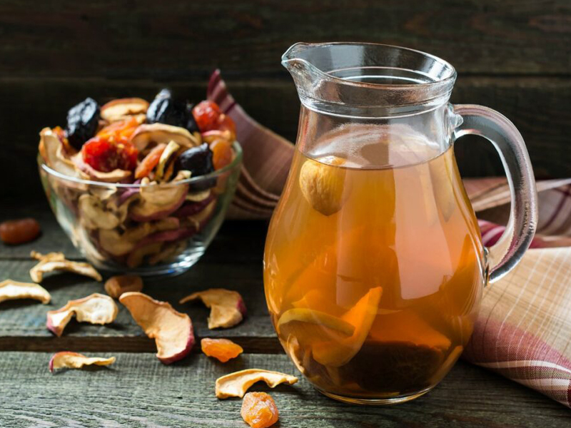 5 л воды, 100 г чернослива, 100 г сушеных яблок, 100 сушеных груш, 50 г изюма, сахар и мед по вкусу.