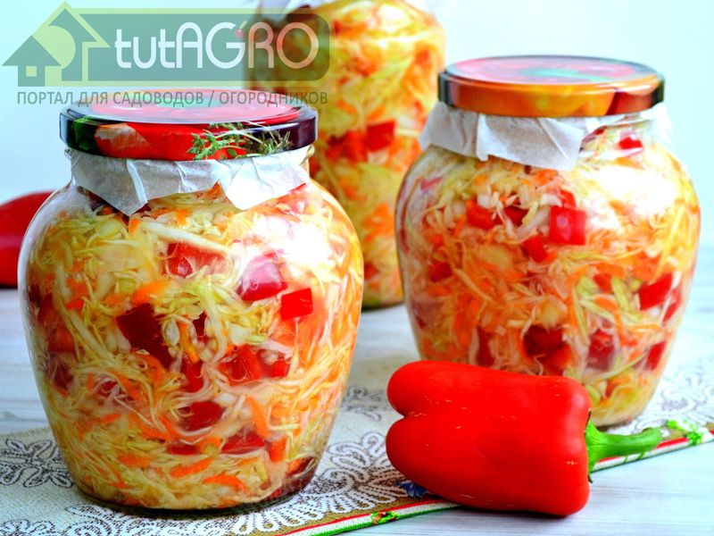 Помидоры (они могут быть как зелеными, так и спелыми, но твердыми) – 2 кг, белокочанная капуста – 1,5 кг, сладкий перец – 0,8 кг, лук репчатый – 0,6 кг, подсолнечное масло – 300 мл, уксус 9% - 150 мл, перец молотый – 0,5 ч. л., черный перец – 15-20 зерен, соль – около 100 г (20 г на 1 кг овощей).
