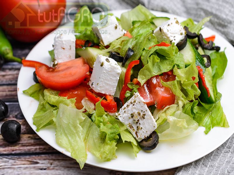 Помидоры, огурцы, перец сладкий, салат листовой, сыр фета, масло оливковое, соль, перец черный.