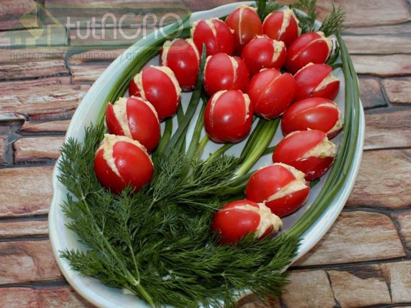Помидор нарезать крест-накрест, осторожно вынуть сердцевину. Творог взбить со сметаной или молоком, соединить с мякотью помидора, заправить чесноком и мелко нарезанной зеленью. Помидоры наполнить фаршем и выложить на листья салата.
