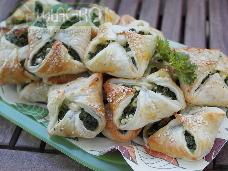 Начинку положить на каждый кусочек теста, защипать края, придав форму конверта и поставить на 10-15 минут в холодильник. Затем вынуть, смазать взбитым белком и поставить в предварительно нагретую духовку.