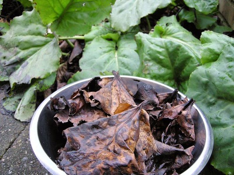 Листья можно начинать заготавливать после трех лет культивирования растения. Весной собрать все потемневшие листья, расправить, смыть с них землю, высушить, измельчить, сложить в емкость для хранения. Можно заваривать их отдельно (1 столовую ложку на стакан кипятка), как обычный чай, можно добавлять к заварке или травяным сборам.
