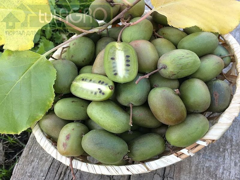 Эта лиана достигает в высоту 6-7 м, у нее изогнутые коричневые побеги, слегка сморщенные листья, ароматные цветки и плоды небольшого размера (3-4 см) - мини-киви.